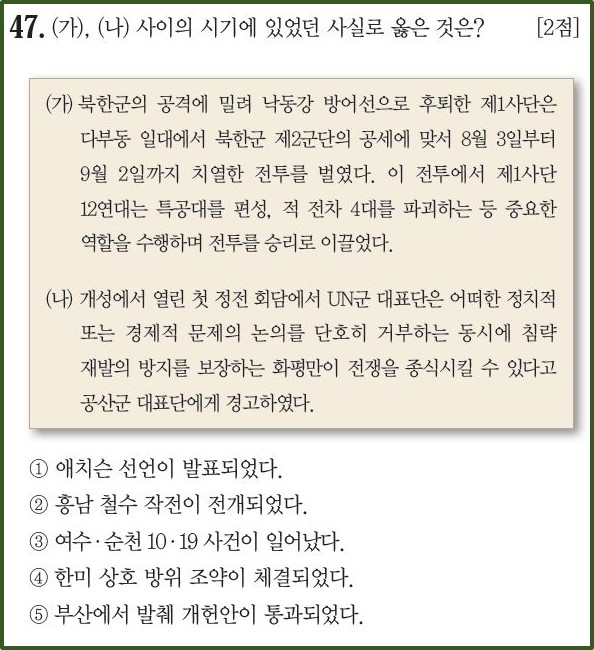 ④ 한미 상호 방위 조약이 체결되었다. (×) - 1953년 6월에 포로협상이 타결되어 8월에 자유의사에 따라 송환되었습니다. 이 때 이승만은 휴전협정을 방해한 목적으로 6월에 반공포로를 대규모로 석방하고 한미상호방위조약을 요구했습니다. 이에 미국은 한미상호방위조약을 체결하고 이승만으로부터 휴전을 동의받았습니다.